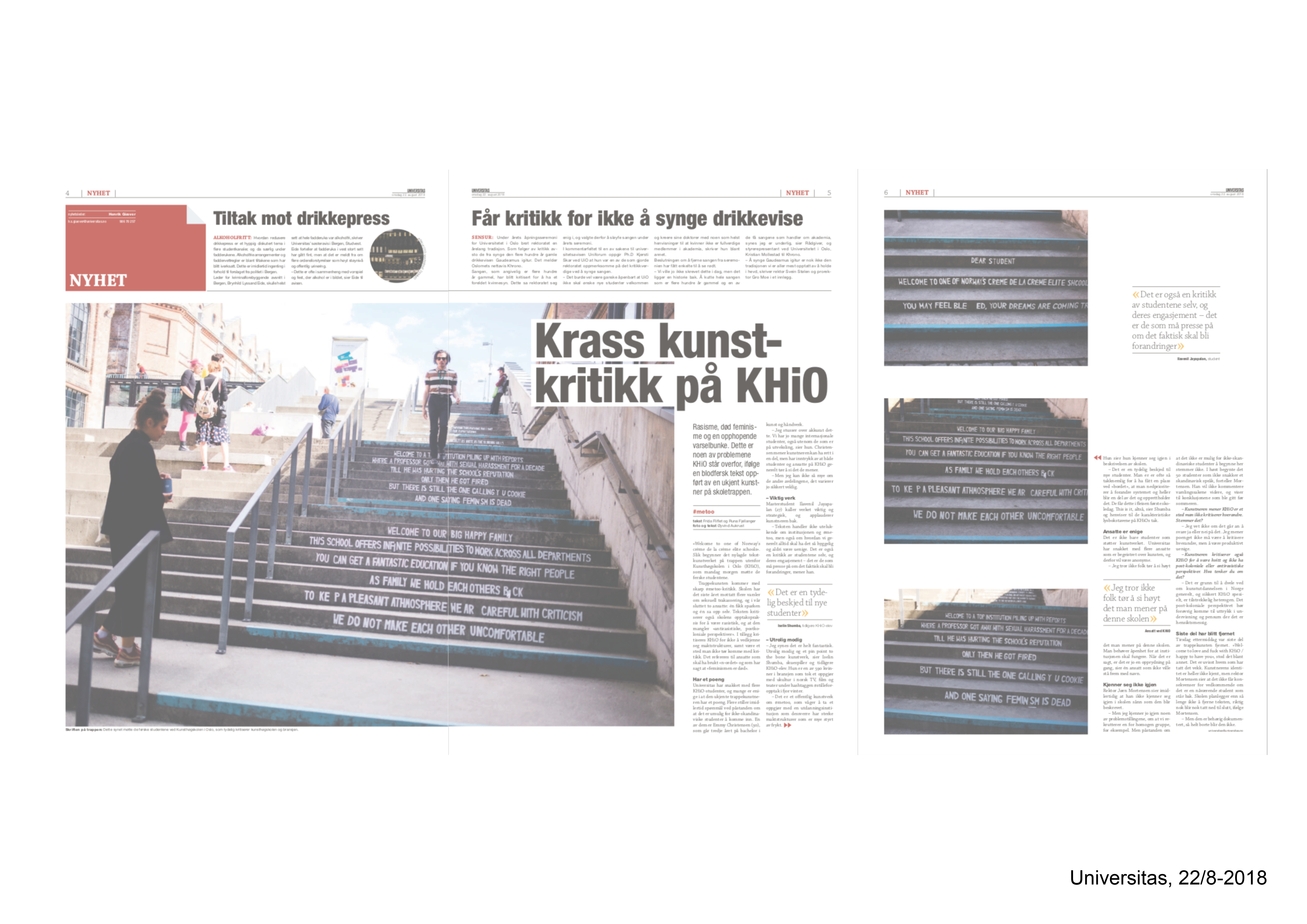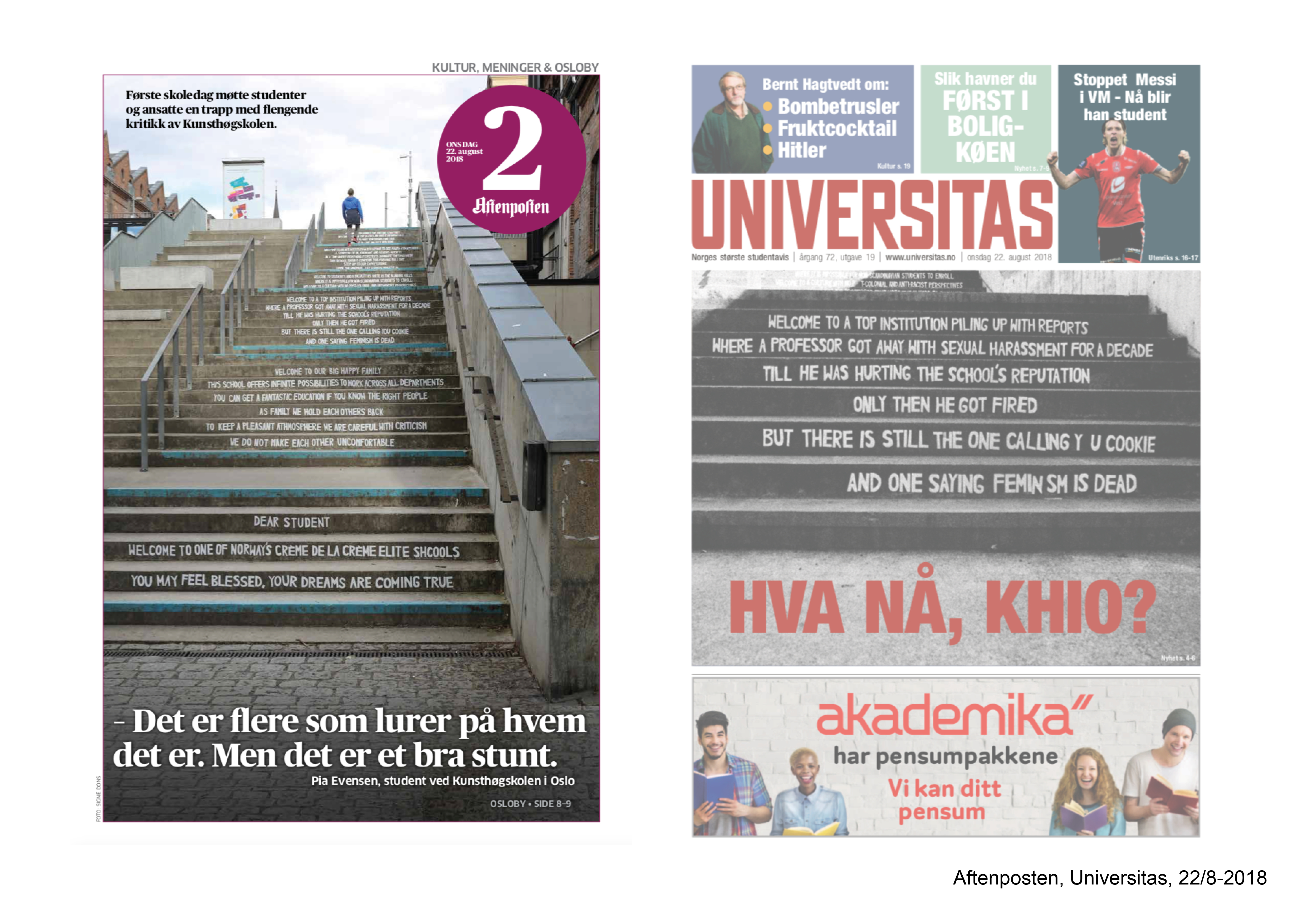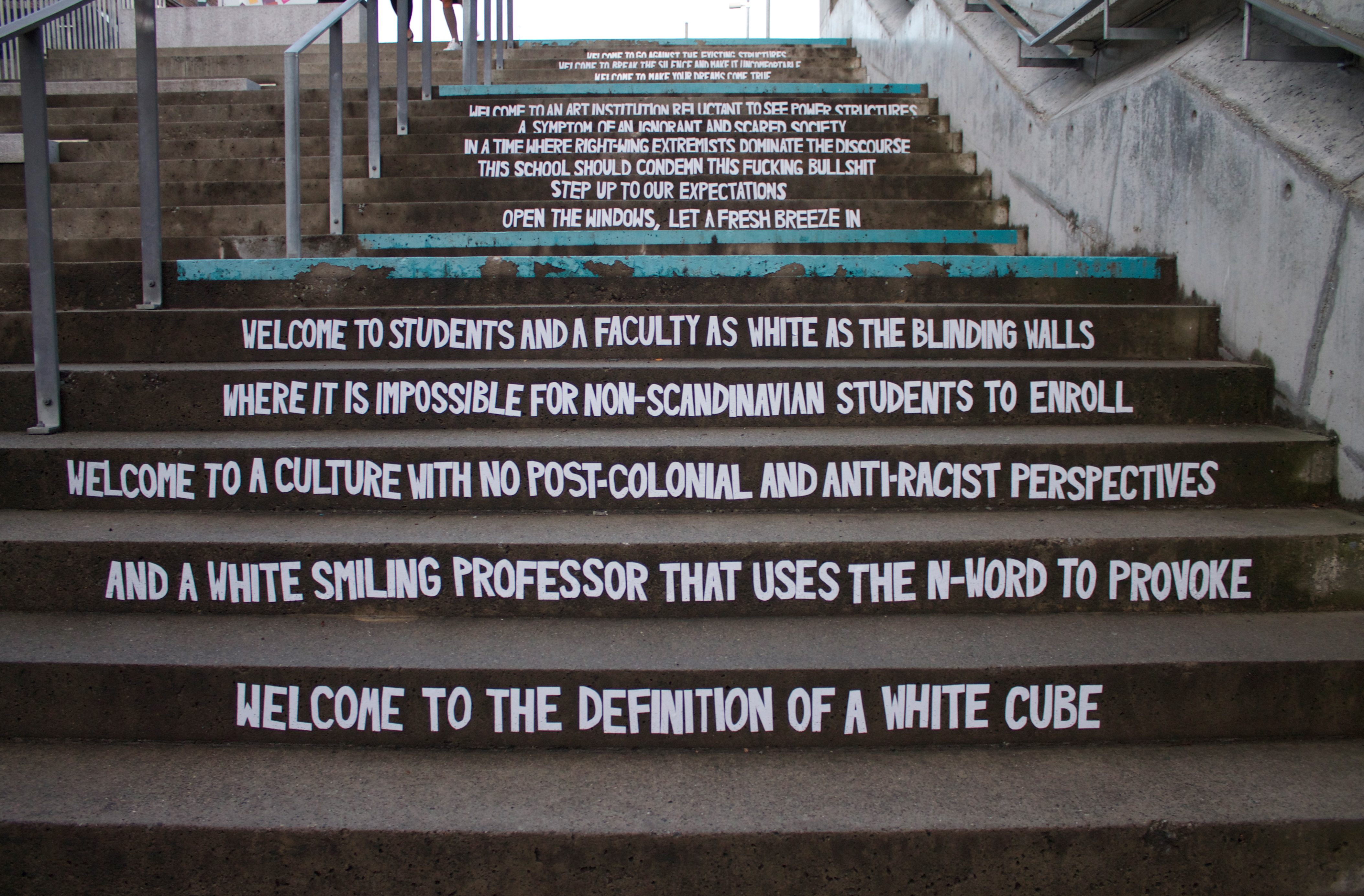 Welcome letter is a context-specific text installation anonymously put upon the entrance stairs of Oslo National Academy of the Arts for the semester opening 2018. It was directed towards new students and faculty of the Academy, as a comment to the principal’s yearly welcome speech, which is held at the same stairs.